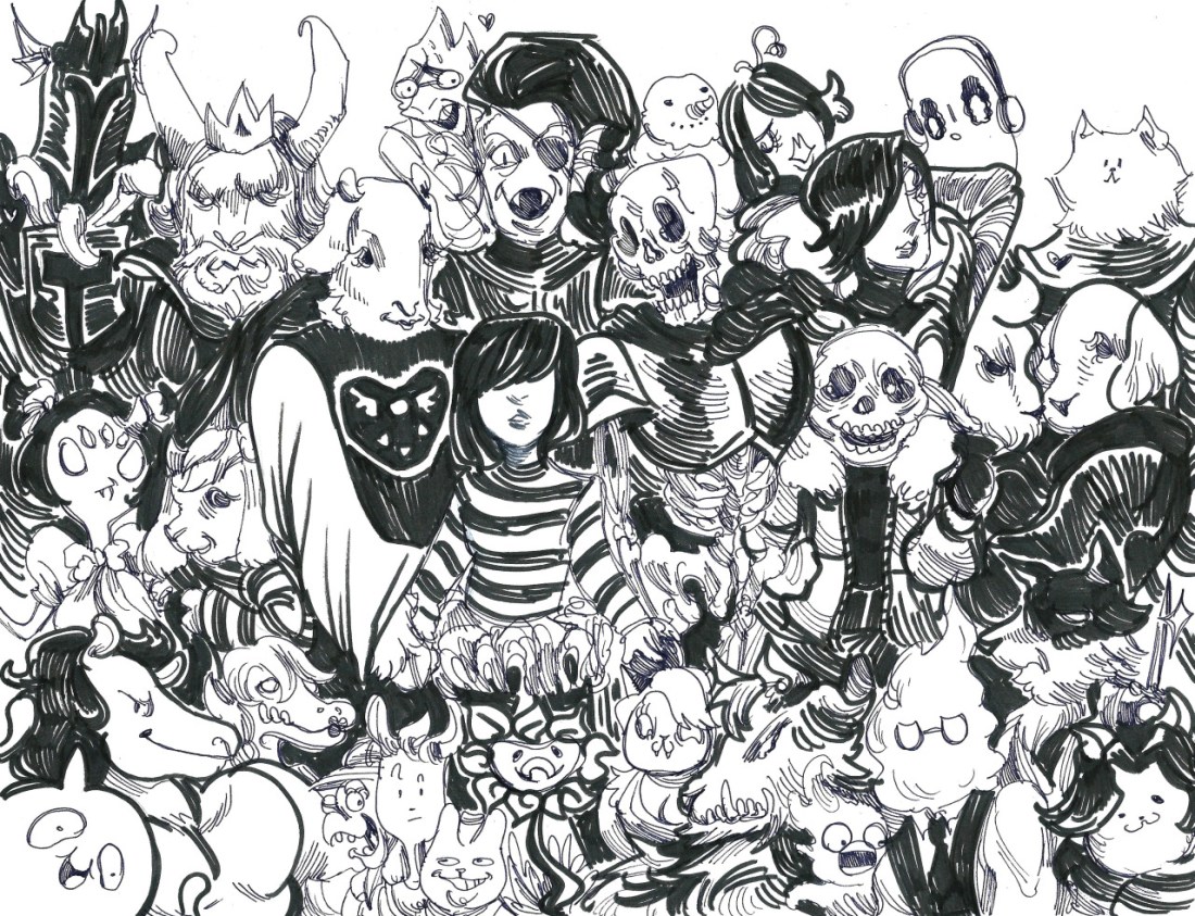 Big ol’ Undertale cast doodle I made for an acquaintance, in exchange for a beautiful, beautiful drawing of Angry Housewife #2. I tried to include everybody worth mentioning.